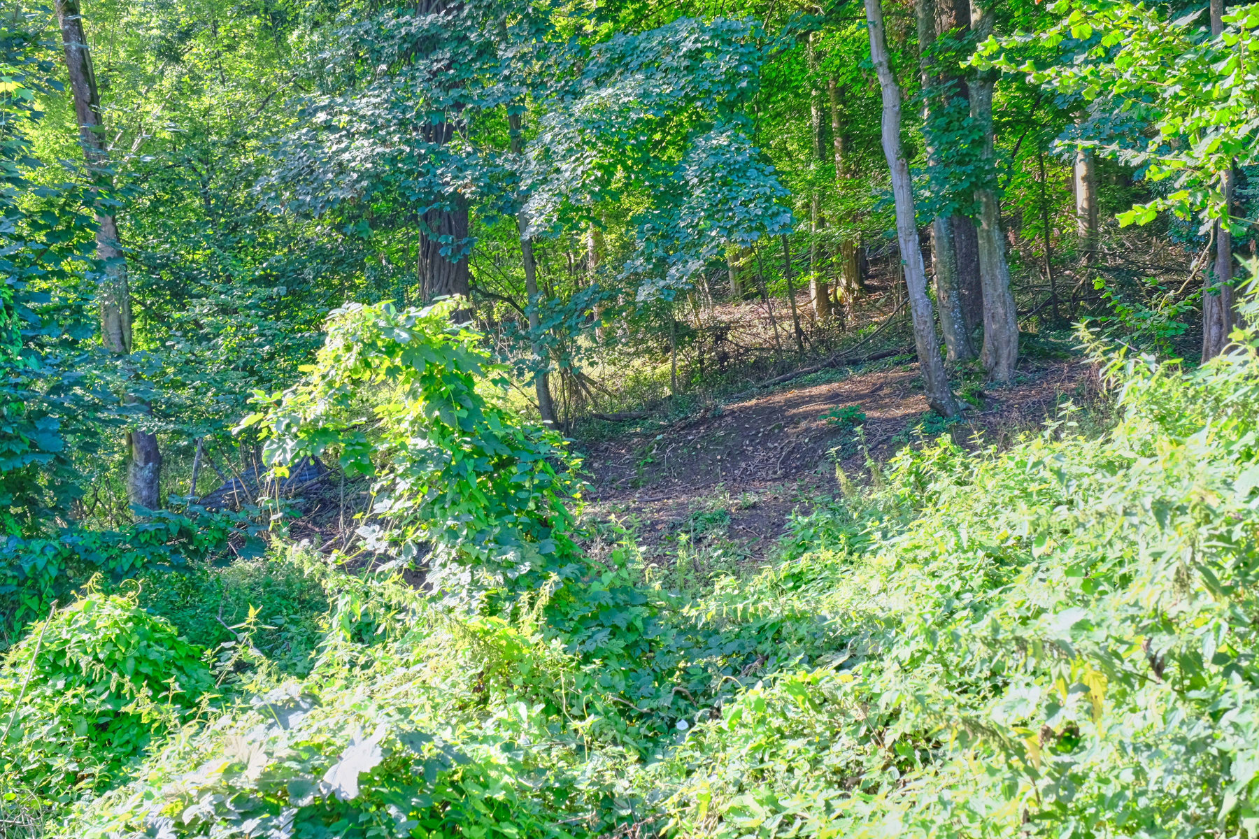 Le terrain en déclivité d’une superficie de 1200 m² à l’avantage d’avoir une belle façade à rue.