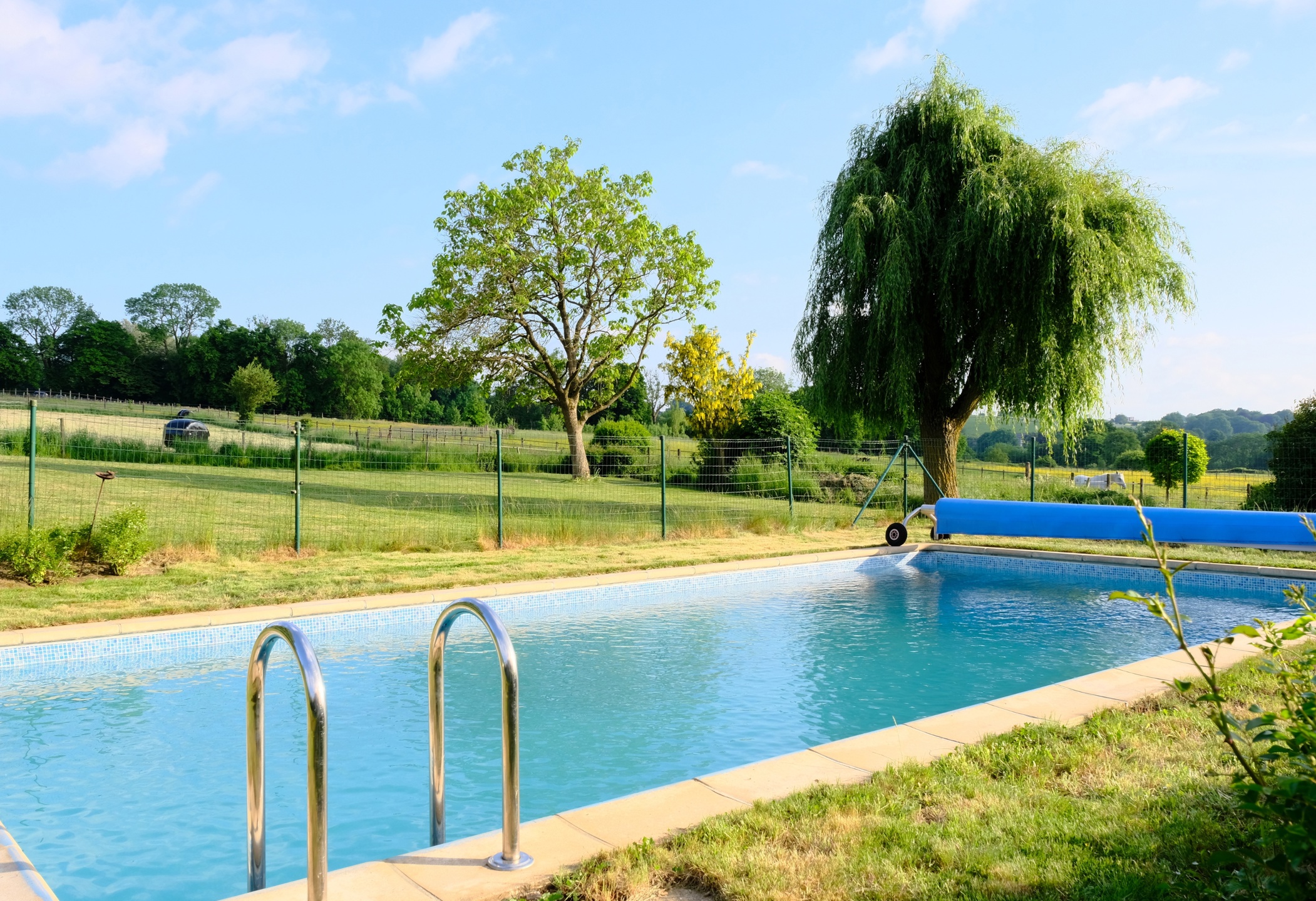 À l’extérieur, quel bonheur de pouvoir profiter du jardin arboré avec piscine, de la terrasse de orientés sud et du panorama qu’offre la campagne environnante. ✨