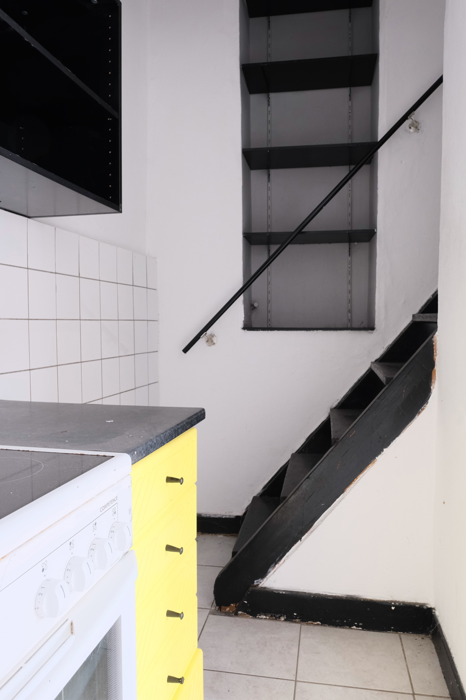 Au rez-de-chaussée, l’entrée se fait directement dans la pièce de vie avec son coin cuisine et un rangement.